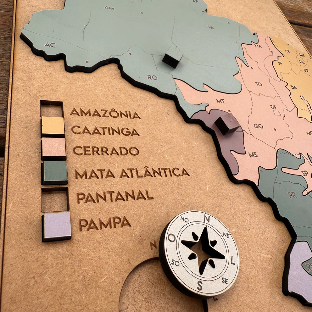 Suporte feito em MDF cru 3mm e peças em MDF colorido 6mm. As peças são correspondentes aos 6 biomas brasileiros e tem gravadas as siglas e fronteiras dos estados bem como as localizações exatas de suas capitais. A legenda do mapa é interativa. Acompanha uma rosa dos ventos móvel.
