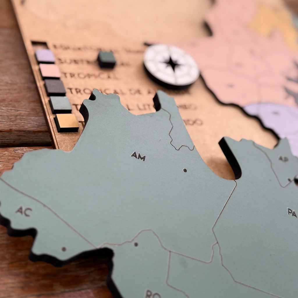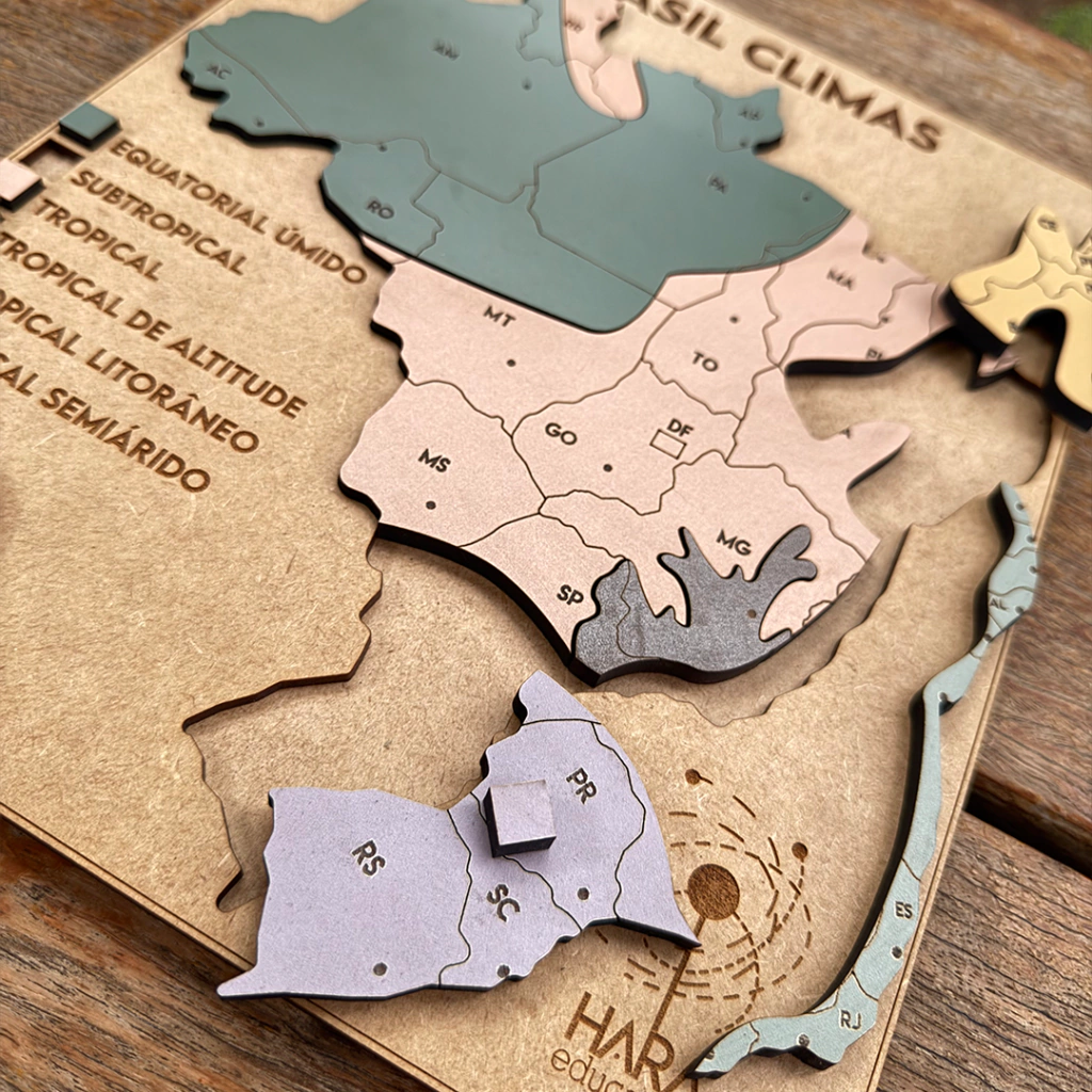 Descrição do Produto: Suporte feito em MDF cru de 3mm e peças em MDF colorido de 6mm. As peças são correspondentes aos 6 climas brasileiros e tem gravadas as siglas e fronteiras dos estados bem como as localizações exatas de suas capitais. A legenda do mapa é interativa. Acompanha uma rosa dos ventos móvel. Tamanho: 30x26 cm.
