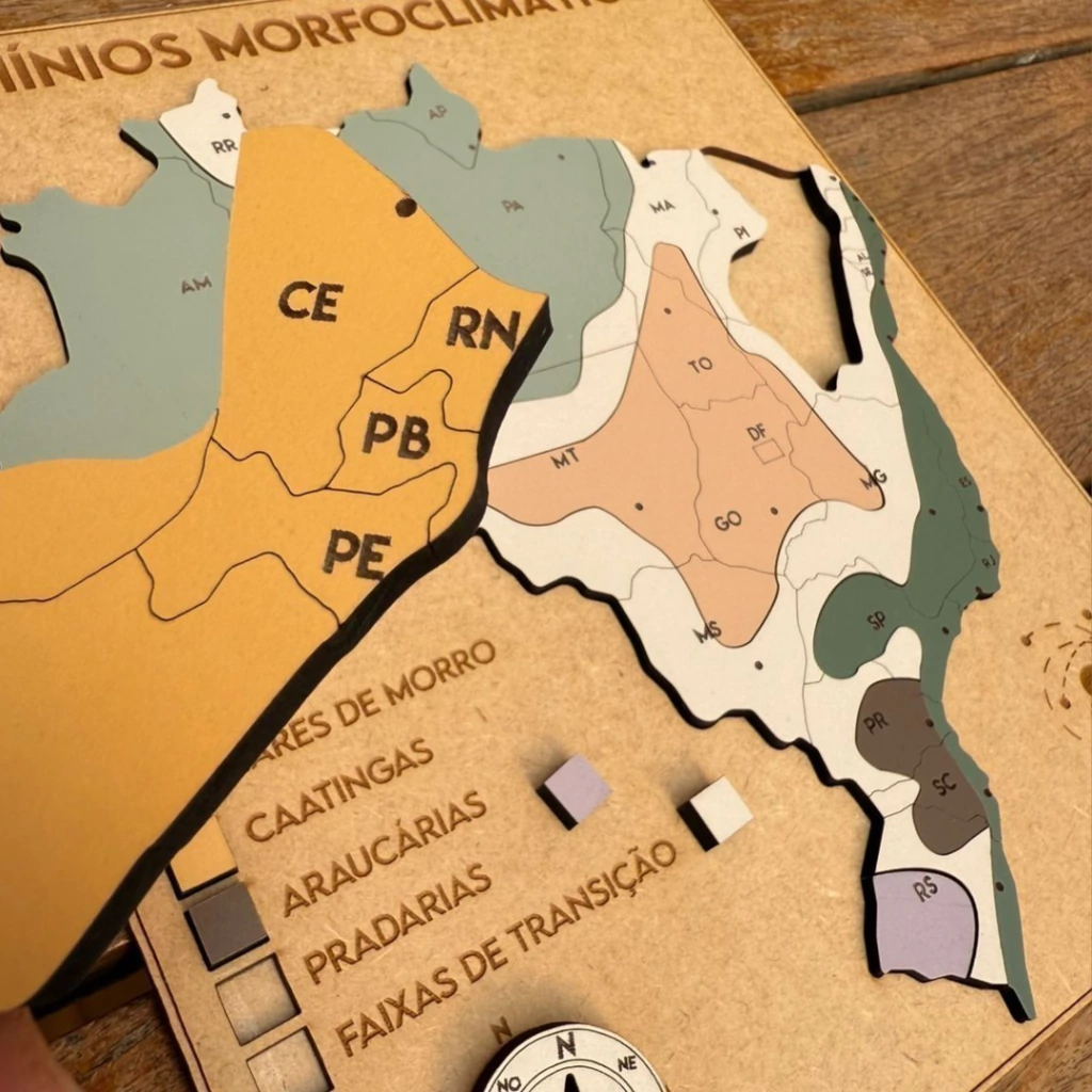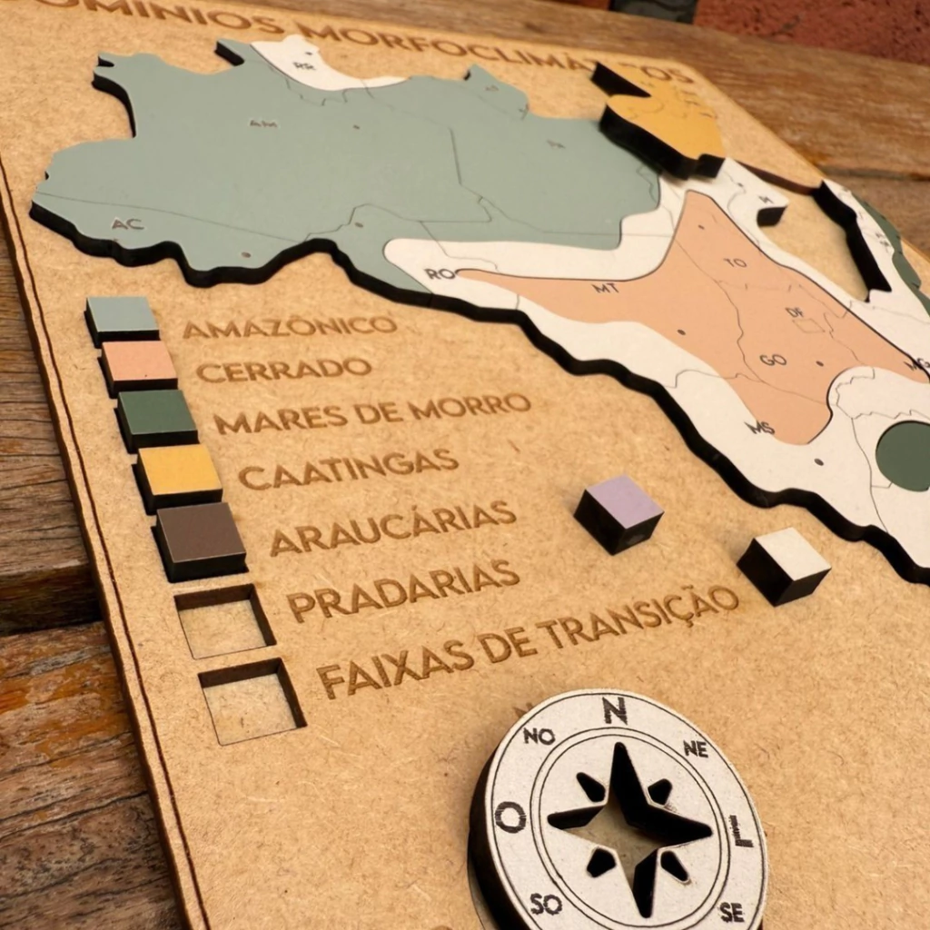 Feito em MDF, ele apresenta os domínios morfoclimáticos do Brasil de forma clara, com peças coloridas que se encaixam perfeitamente no suporte.